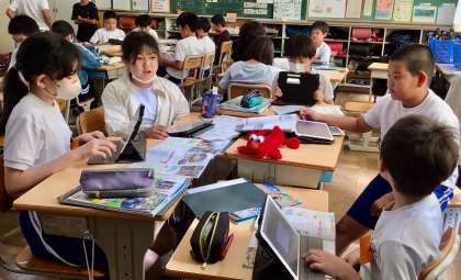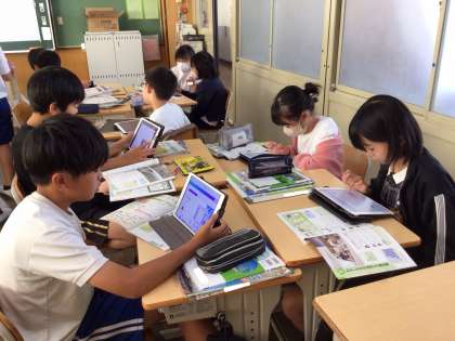 各自が授業の話し合いなどで個々の意見をリアルタイムに共有しながら協働的な学習を進めていました。