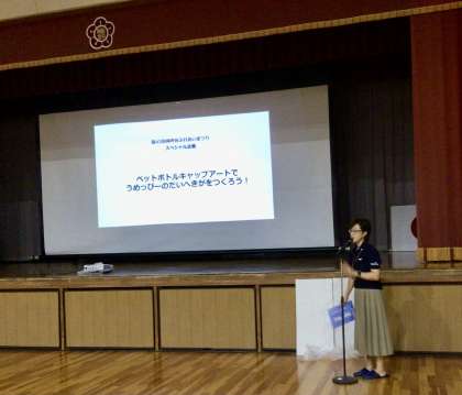 お話のなかで、6年生の山本さんがデザインしたキャラクター「うめっぴー」の大壁画を作ろうという企画をやります。ペットボトルキャップアートです!!