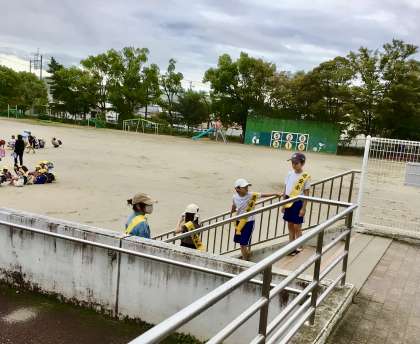 生活委員の皆さんの呼びかけ、見守りのおかげで、雨の上がった運動場にすばやく集合できました!