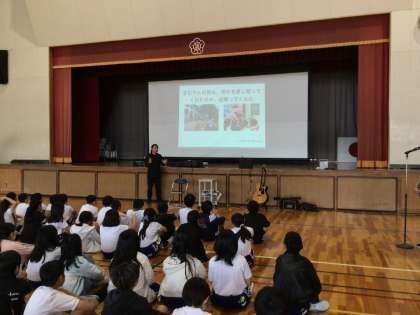 パソコンからの映像をスクリーンに投写しながら、手話を使って熱く語ってくださる姿に子どもたちは心を揺さぶられる交流会でした。