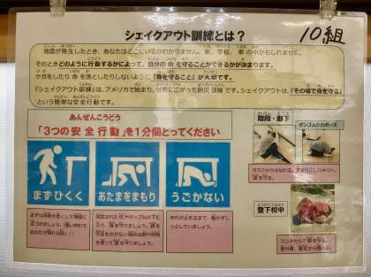 シェイクアウトで、ダンゴムシのポーズをとり、特に頭を守りましょう。