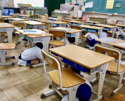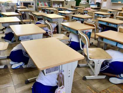 緊急放送が流れると、子どもたちは、すぐに机などの下に。