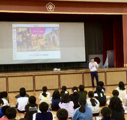 今日は、みんなになじみのあるアメリカを取り上げ、アメリカの衣食住について知識を広げ、世界の文化への関心を高めることがねらいです。