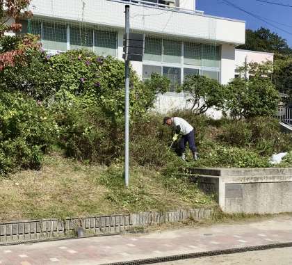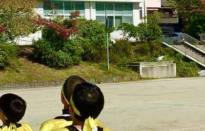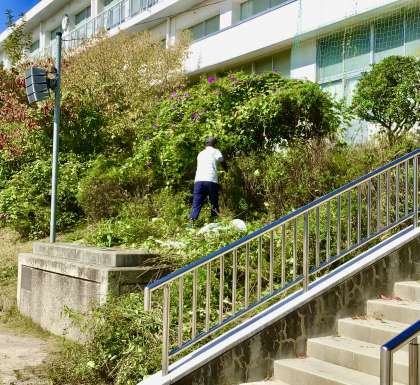 高学年の練習中、運動場の斜面の樹木の伐採や草刈り作業をしてくださっていたのは、校内整備員さんです。