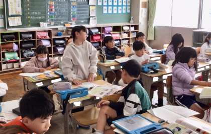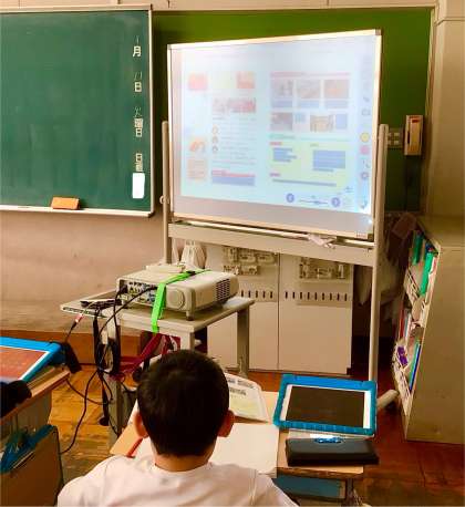 教師は、デジタル資料をタブレットから投写して、子どもたちの思考の深まりを支援していました。