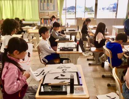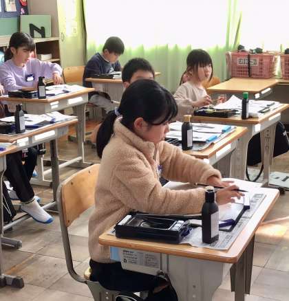 静まり返った教室の中で、筆を運ぶ子どもたち。