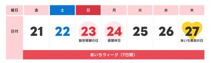 11月21日から27日までを「あいちウィーク」とし、期間中の1日を「県民の日 学校ホリデー」として学校休業日にしています。