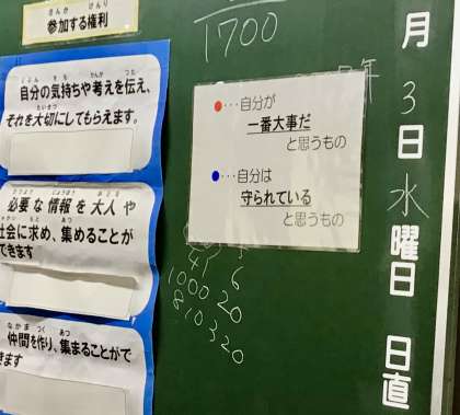 子どもたちは、この中から、一番大事だと思うもの、守られていると思うものを選び、シールを貼っていきました。