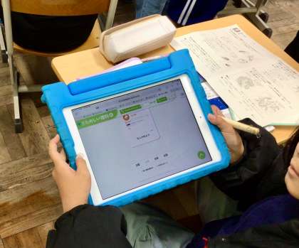 学習用タブレットで教科書上のQRコードを読み取ると、復習できるアプリにつながります。
