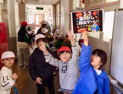 隠されたなぞなぞを探し、答えの合い言葉をそろえて、脱出までのタイムを競います!