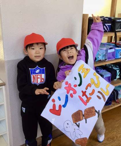 ピンポン玉を紙皿に乗せて、ゴールまでのタイムを競い合いました。