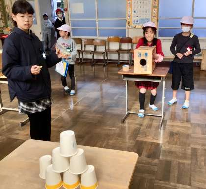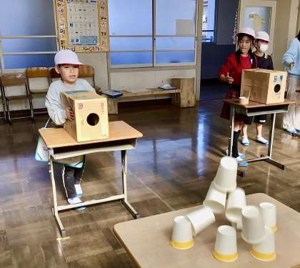 ダンボールをタイミングよくたたき、空気が飛んでいくと紙コップが倒れます!