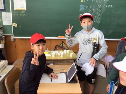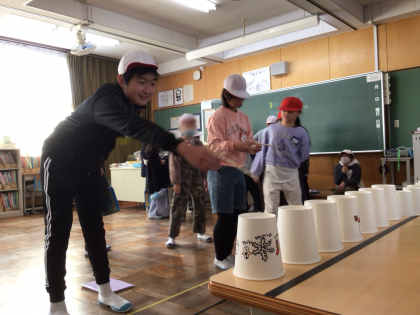 射的の得点をタブレットで集計する係の子どもたちです!