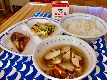 今日は、かしわ汁に、さばのカレー揚げ。