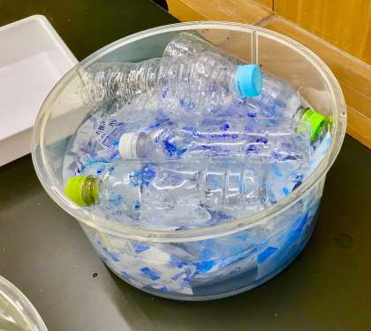 空気の温度と体積の関係を、ペットボトルを使って調べていました。