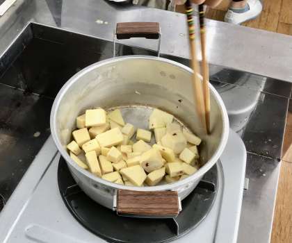 教科書通りのみそ汁ではなく、先日自分たちで育てたサツマイモも入れ、切る、炒める、煮るという過程をふみました。