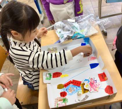 切る、はる、はさむ、留めるなど、手先をフルに使って作品づくりに励む1年生の皆さんでした!