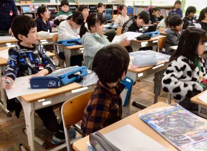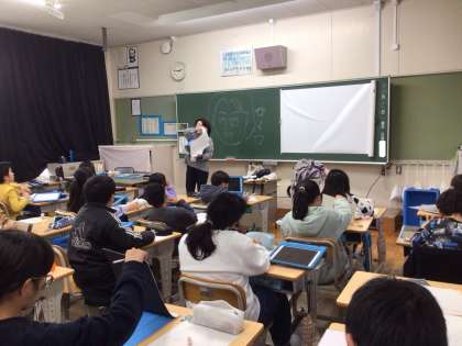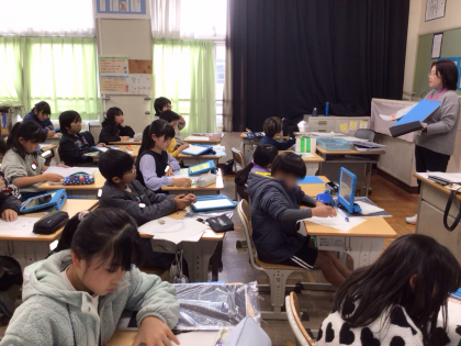 子どもたちは、タブレットで撮影した自分の顔を、よく観察しながら下絵を完成させました。