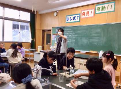 教師は、試験管の表面張力にふれて、横からよく観察するとよいことをアドバイスしていました。