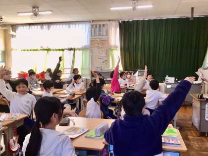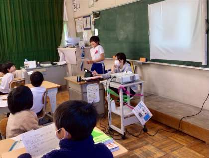 教師は、子どもたちが作った直筆のクイズをタブレットに取り込み、スクリーンに投写しながら進めていきます。