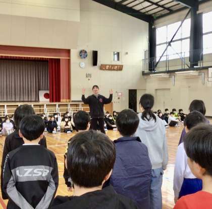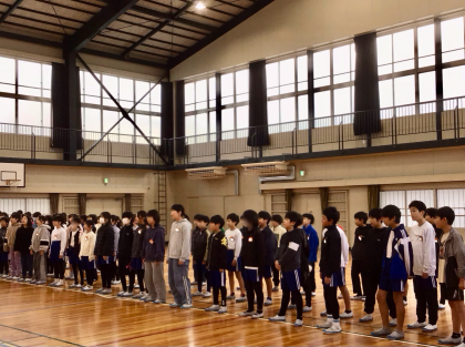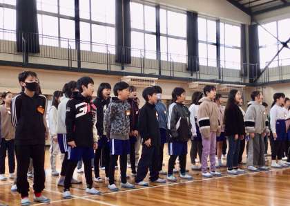 朝の体育館で、5、6年生が合唱の歌い合いを行いました。