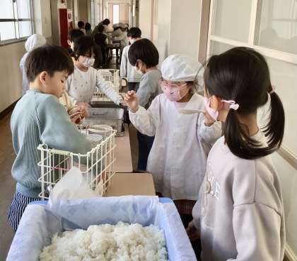 午前中、校外学習で交通安全のマナーやルールを学んできた、元気いっぱいの1年生の給食風景をお届けいたします♪
