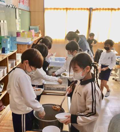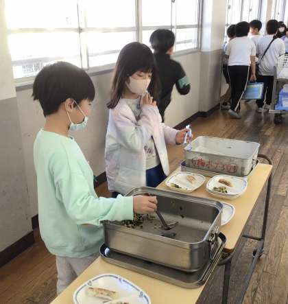 冬休み前の週のため、給食当番はエプロンなしで配膳しています。