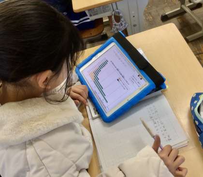 資料の棒グラフから読み取れることを書き出しているところです。