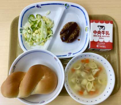 今日は、ハンバーグにパスタスープ。