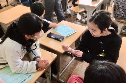 お酒を飲み過ぎると、どんな弊害があるかを学んだあと、養護教諭は、子どもたちの手首の少し下あたりに、消毒用アルコールを染み込ませたガーゼ付き絆創膏を貼り、はがして数分後に皮膚の赤みを観察するようにしました。
