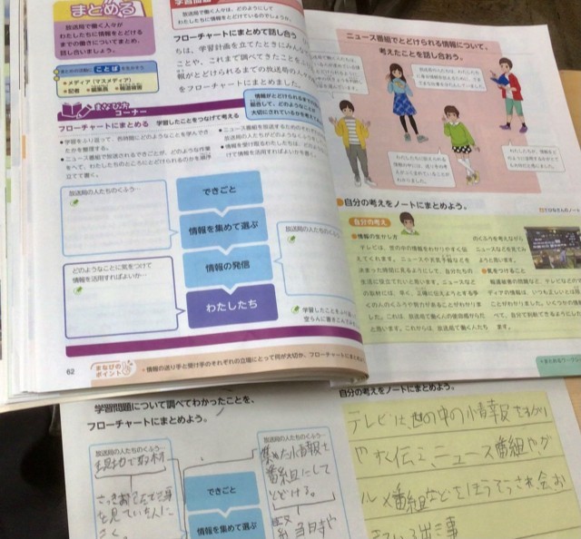 子どもたちは、テレビ、新聞の役割やニュース番組ができるまでの流れ、情報化社会のよさと問題点などを タブレットやフローチャートなどを使って丁寧に確認していました。