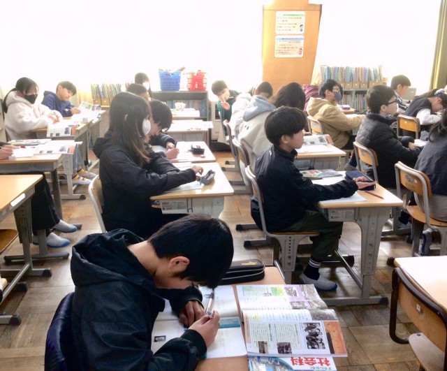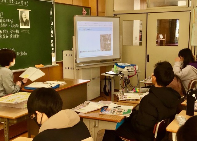 日本が近代国家として成長し、国際社会へ関わっていく過程を、洋服の普及、ラジオ放送、民主主義、女性の地位向上、重工業の発達などのキーワードをもとに、中心人物の動きに着目して学んでいました。