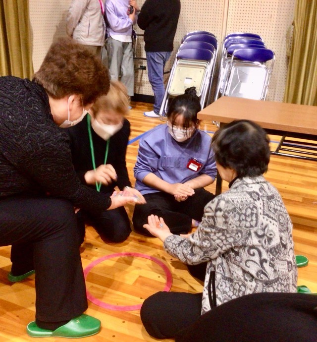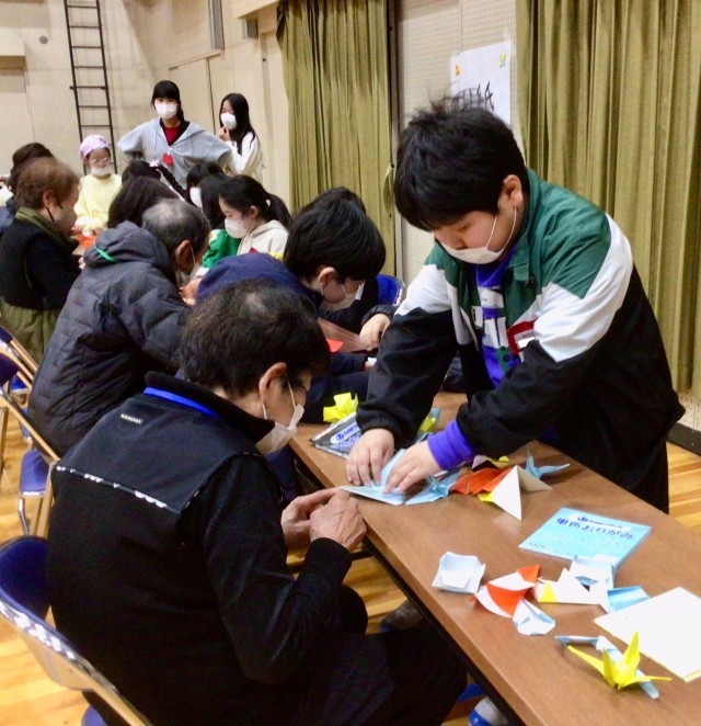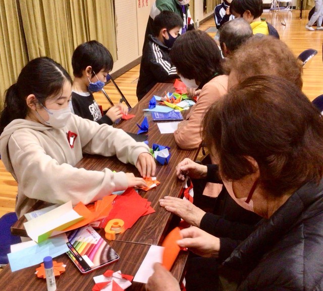 折り紙では 高齢者の方が分かりやすく教えてくださる場面もあり、交流がいっそう深まったようです。