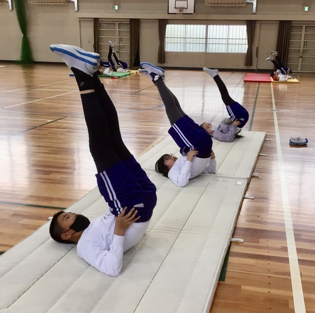 マット運動では、基本的な回転技や倒立技を身につけ、それらを組み合わせる楽しさを学ぶことがおもなねらいです。