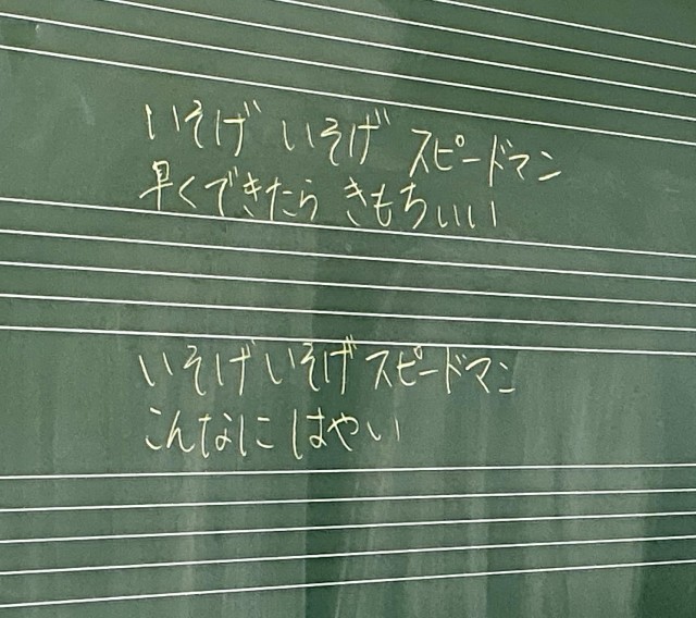 教師が、リズミカルな「いそげ、いそげ、スピードマン…」の歌を子どもたちに紹介し、この曲が流れたら片付けに入ることを確認していました。