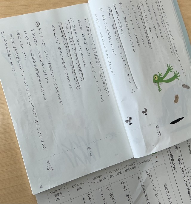 子どもたちは「緑色のリボンのようなかえる」の気持ちをさまざまな観点から読み取っていきました。
