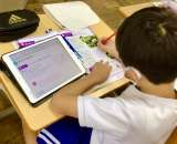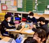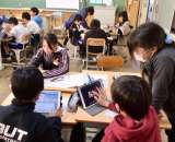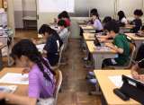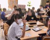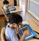 1組です。シーンとした教室。 集中してタブレットに向かう子どもたち。 子どもたち...