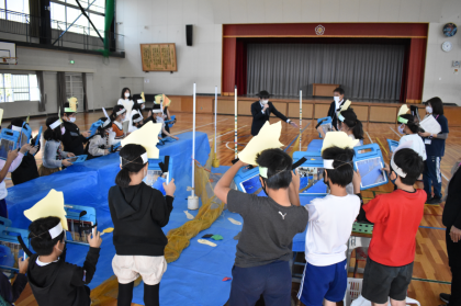 体育館で国語「ごんぎつね」の授業をしました。郷土資料館の方の協力のもと、本物の張...