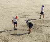 「なかなか水が引かないね…」 運動場の水たまりをのぞき込み、今後のグランド状態に...