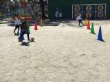 コーンの周りをボールを蹴りながら走りました。うまくコントロールすることが難しそう...