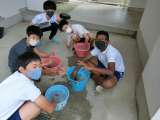 家庭科で自分で持ってきたハンカチや靴下を手洗いする授業を行いました。手洗いの中...