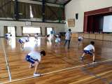 体育館でソーラン節の練習をしていました。広いスペースを使い、体を大きく動かして踊...