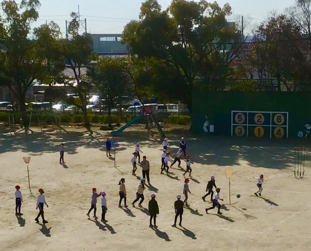 1組です。晴天の中、ゴール型ゲームのポートボールをしています。この学習では、ルー...