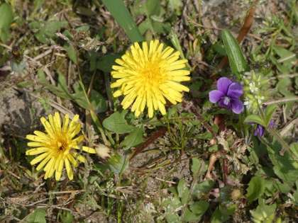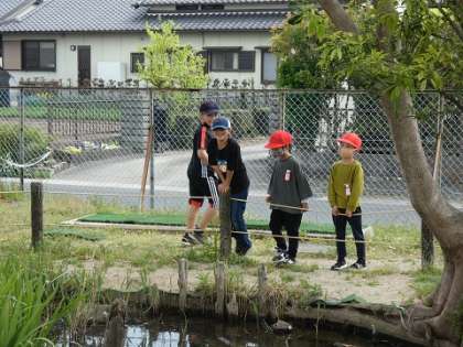 タンポポ、スミレ、カラスノエンドウの花を見つけました。また、畝部愛ランドの池にはメダカやザリガニがいるよと子どもたちが教えてくれました。