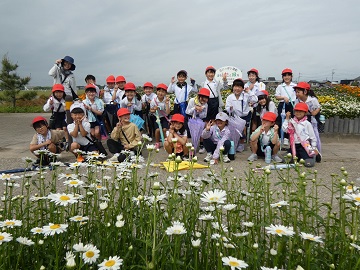 きれいな花壇の前で記念撮影しました。道路沿いの景色の中にもあらためて見るといろいろな発見があります。