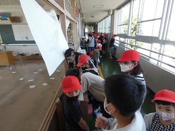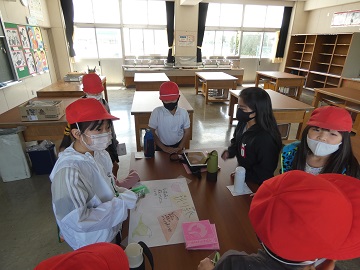 1年生に学校を紹介しながら、ファミリー班で校内ウォークラリーをしました。