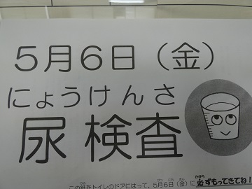 尿検査があります。お忘れのないように 公開日 2022/05/02 更新日 2022/05/02 お知らせ 連休明けの5月6日は、尿検査の検体の提出日です。写真の用紙をトイレに貼って忘れないように提出してください。ご協力よろしくお願いします。