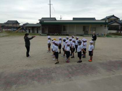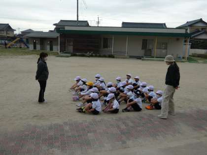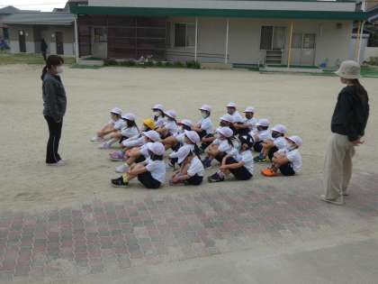 整列の練習や体操座りの練習等しました。運動場でも先生のお話をしっかりと聞いています。