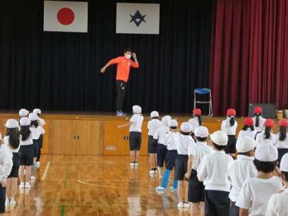 3年生は、「走り方教室」で中京大学の川端魁人選手をお招きして、走り方を教えてもらいました。オリンピック選手の川端選手の専門的な専門的な指導に子どもたちは目をキラキラさせて練習していました。