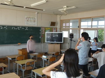 児童集会は、運営委員会の企画・運営で進行していきます。運営委員会が、「畝部小学校が、明るく、楽しく、優しい学校になるように」という願いを込めて、「畝部〜ピース」の掛け声とともに両手でピースをするという掛け声と振付を考えてくれました。